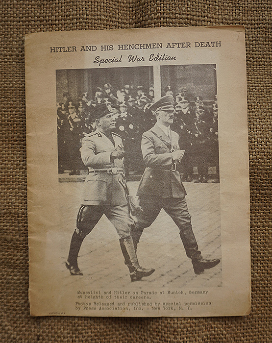 一共16页,尺寸:21X28CM,特刊是德国纽仑堡审判完结并对战犯实施死刑后发行的,内容图片均来自美联社,包括党卫军领袖希姆莱自杀后的官方照,党卫军奥斯维辛集中营指挥官约瑟夫·克莱默绞刑照、空军元帅戈林自杀照、外交部长里宾特洛甫绞刑照、国防军凯特尔元帅绞刑照、内政部长威廉·弗里克绞刑照、国防军作战部长阿尔弗雷德·约德尔大将绞刑照及受占地区领导人受刑照等等,并附上了他们所犯下暴行的证据图片,倒数第二页有一张首次公开的沙漠之狐隆美尔元帅自杀后遗体的戎装照,末页补充了一张东条英机的自杀照等等。当代已知的个别战犯