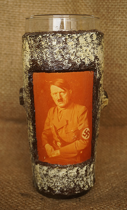 高18.5CM,杯口直径7.5CM。材质:人工水晶玻璃套仿木(电木,98K手柄材质),侧面嵌入元首相片。