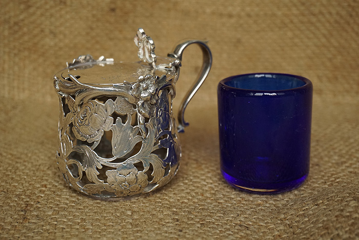 由一个琉璃内杯和镂空花饰银质外壳构成,外壳直径6CM,高5.8CM,重143克,含内杯总重241克。镂空的花饰纹理清晰立体感强烈。清洁后完全可以充当功夫茶杯使用。