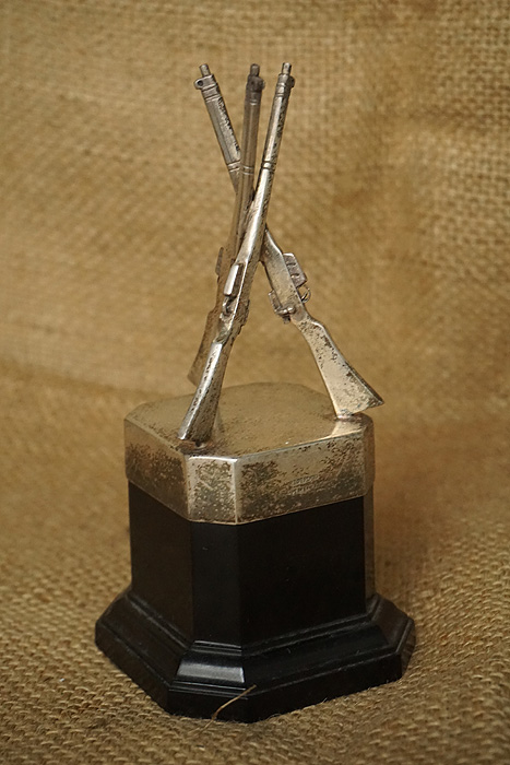 总重60.5克,直径5.4CM,高11CM,产地:英国伯明翰,年份:1912年,杯身由三把MK1 1903步枪为装饰托底。