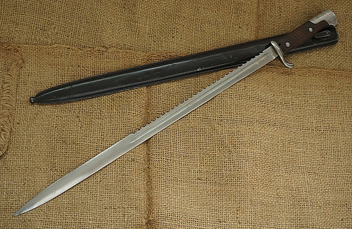 极其稀罕收藏品种,总长28CM,兼具近身防卫格斗与上木仓冲锋两用功能。一战中后期在军用原材料日益紧缺的情况下发行。该刀整体全品相,刀身轻微使用状态,刀鞘烤蓝完整,刀鞘上的皮绑带保存完美。