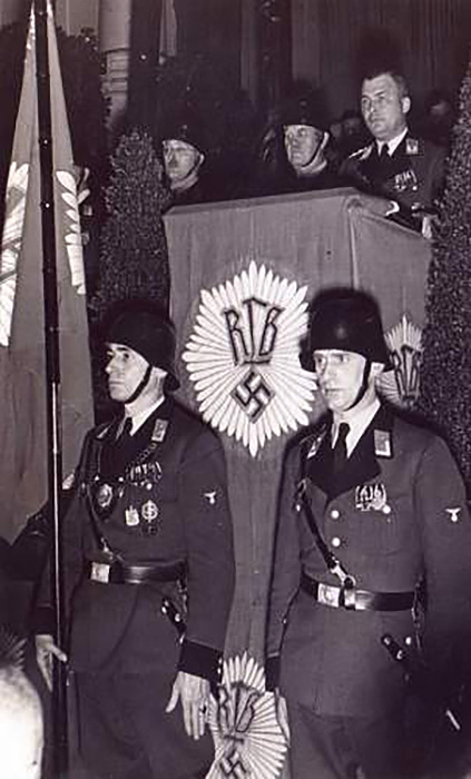 该礼兵刺总长35CM,配原皮挂。难得遇到由陆军机枪手、炮兵和装甲部队三兵种组成精美的图案。刀身德文格言:Zur Erinnerung an Meine Dienstzeit,即铭记我服役的时光。原鞘漆保存80%,无磕碰。